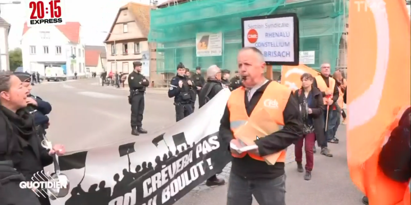 Aujourd'hui, 19 avril 2023, trois mois jour pour jour après la première journée de mobilisation contre la réforme des retraites, Emmanuel Macron est venu à Muttersholtz pour visiter l'entreprise MATHIS, qui construit des charpentes pour les JO de 2024, et dont le patro...